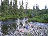 Nachdem wir uns von Whitehorse mit dem Wasserflugzeug an die Caribou Lakes haben einfliegen lassen, beginnt unsere Kanu-Tour im Caribou Creek, der die 1000m hoch liegende Seenkette entwässert und als Bach sich gegen Norden dem Oberlauf des Liard entgegen schlängelt. Beim Zusammenfluss ist auch der Liard River noch ein Flüsschen, sehr schnell fließend, knietief und etwa 25 m breit.